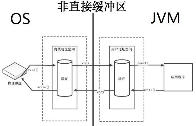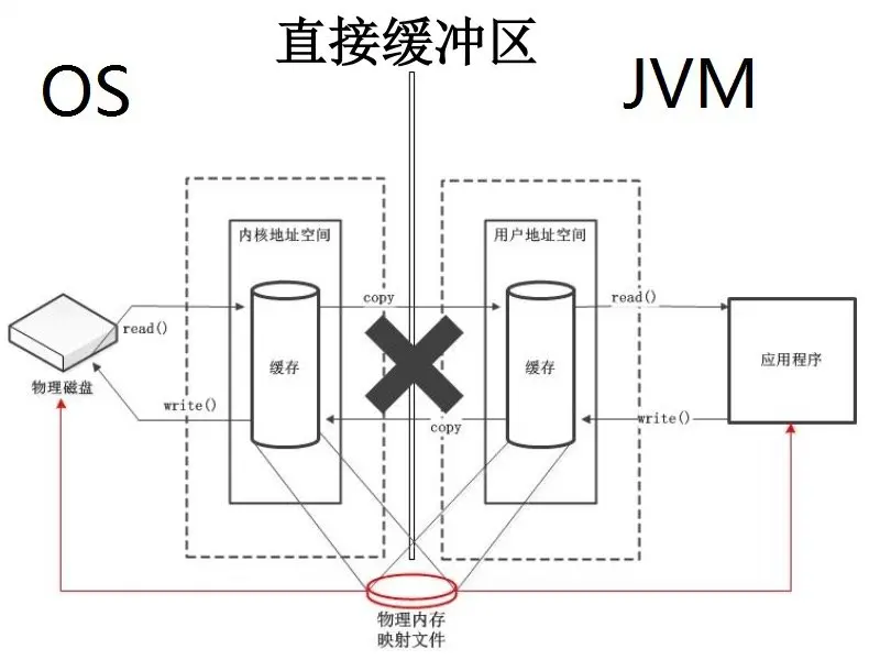 直接缓冲区:直接缓冲区不需要内核空间作为中转copy数据,而是直接在物理内存申请一块空间,这块空间映射到内核地址空间和用户地址空间,应用程序与磁盘之间数据的存取通过这块直接申请的物理内存进行交互。