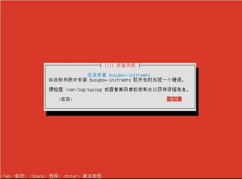 首先,点击继续,返回上一层页面,选择shell, cat /var/log/syslog 找到报错信息 base-installer: error: exiting on error base-installer/kernel/failed-package-install