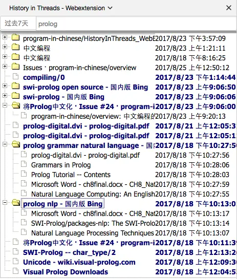 插件功能很简单, 就是根据网页点击顺序生成树, 每个树可以认为是主题相关的. 比如, 从一个B搜索页A点开了其中一个页面B, 显示搜索结果时B就是A的子节点(如下图的"proglog nlp - 国内版 Bing"). 火狐浏览器对页面点击顺序的保存维护好像比Chrome好一些. 生成的树比较完整(相比Chrome版).