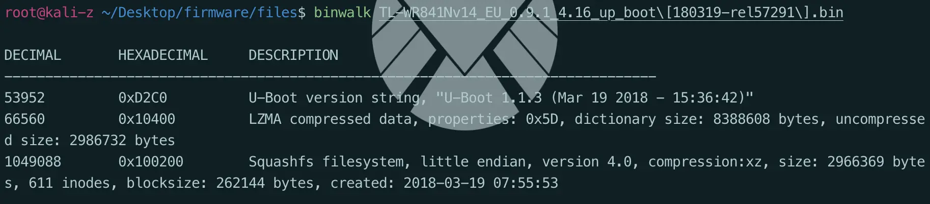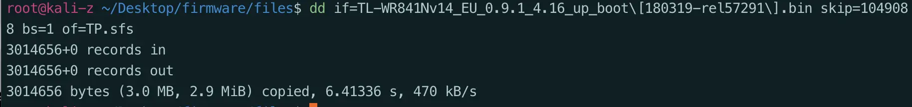 dd if=TL-WR841Nv14_EU_0.9.1_4.16_up_boot\[180319-rel57291\].bin skip=1049088 bs=1 of=TP.sfs