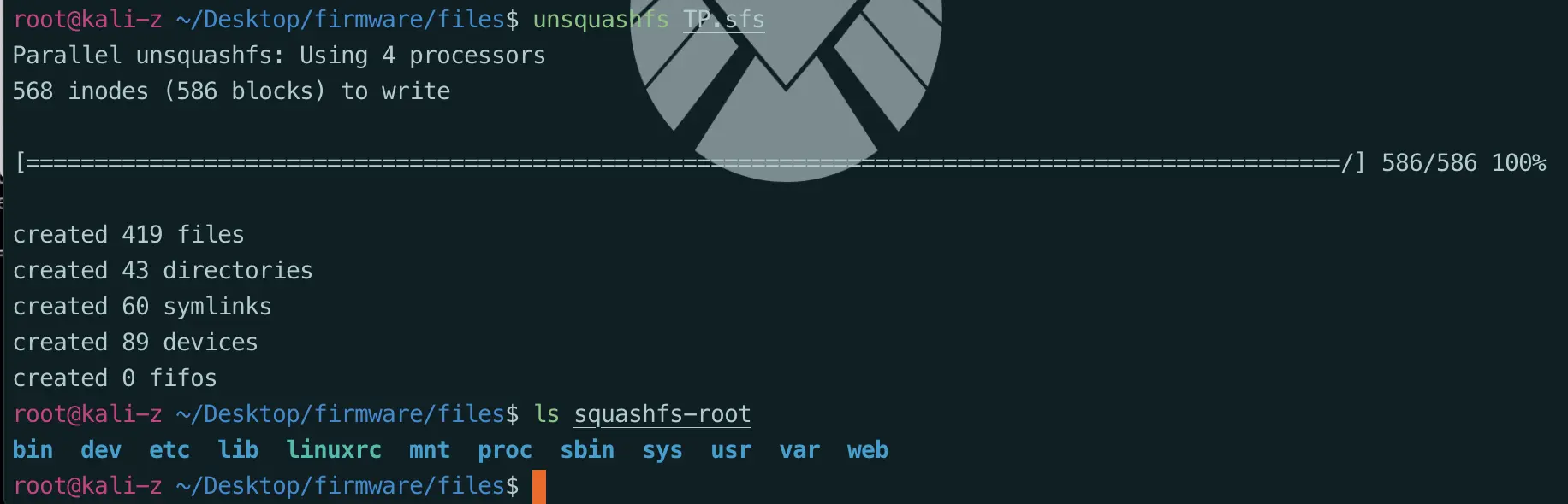 最终得到dd命令分割之后的文件TP.sfs,这是一个存储Squashfs文件系统的文件。之后可以使用unsquashfs工具来对其中的文件系统进行提取。提取完成后会自动创建一个squashfs-root文件夹。