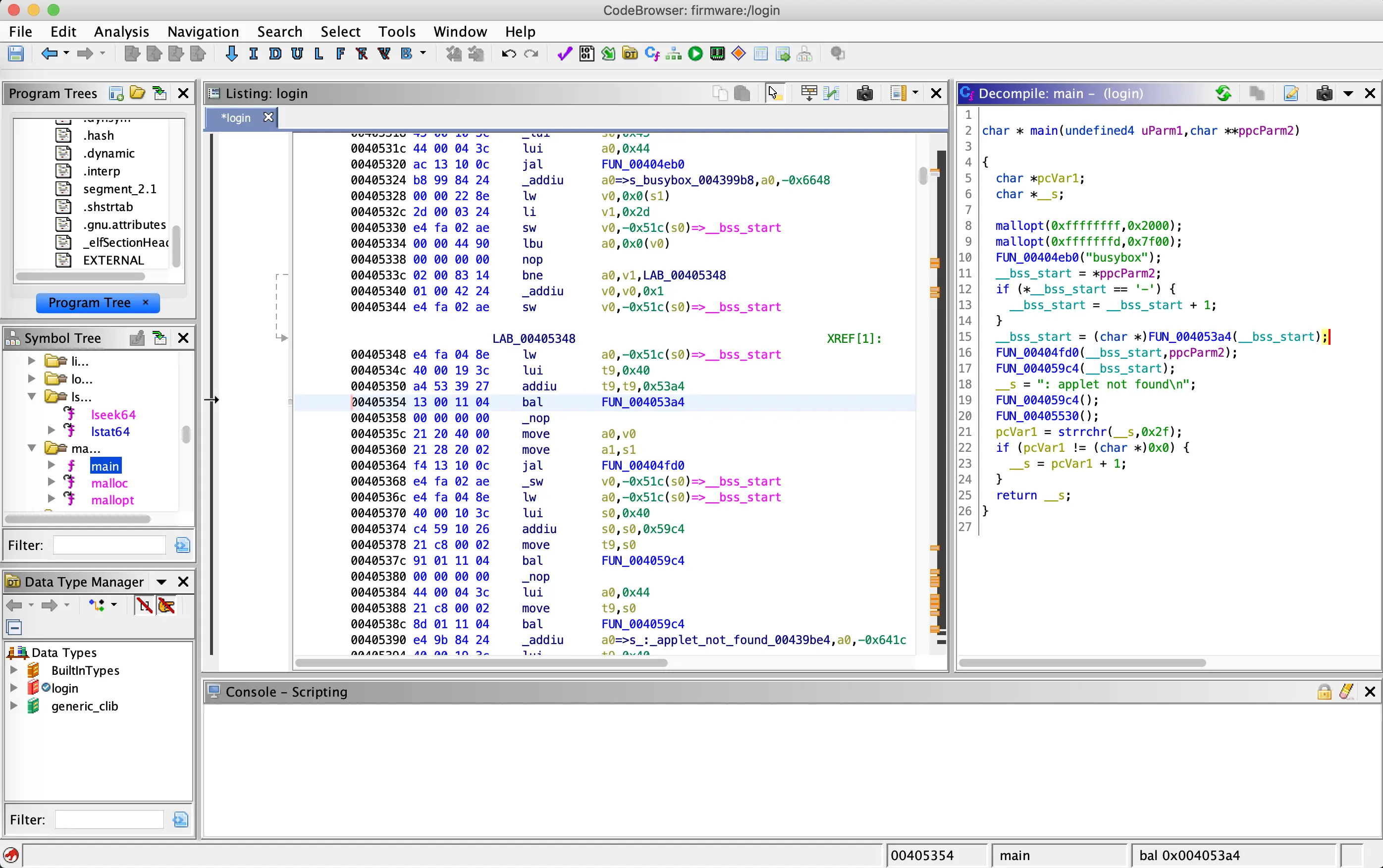 之后在bin目录下看到login文件,可以使用IDA来对这个文件的登录逻辑进行分析,可能存在登录绕过或者命令注入等漏洞。