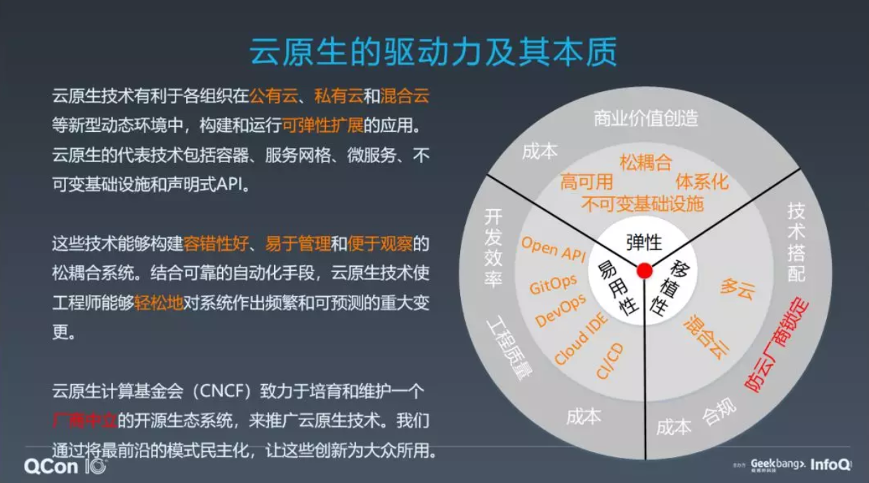 上图的左侧,作者列出了 CNCF 对于云原生的官方中文定义,其中使用橙色和红色高亮的内容,与作者在这里所表达的核心驱动力和所解决的本质问题是同意但不同样的表达。