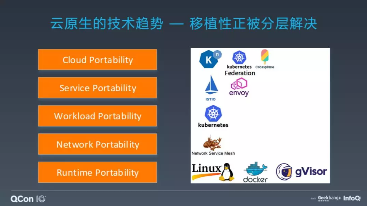 简单说来,云原生的技术趋势是围绕应用的可移植性问题,以一致性为目的,通过分层去解决。上图的左侧列出了五个层次,右侧则示例了对应的部分开源软件。最上层的 Cloud Portability 与前面讲的应用的移植性是同一回事。