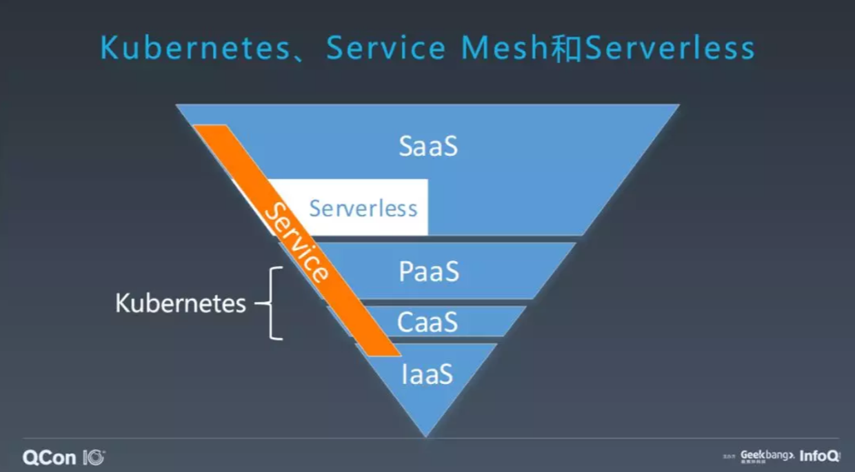 这张图能帮助我们理解 Kubernetes 和 Serverless 的位置关系。Kubernetes 今天仍在发展,包含了 CaaS 和 PaaS 两大块的内容,且有做厚的趋势。平台技术做厚的好处在于,会对下面的基础技术的演进有更强的掌控力,也会因为做厚而使得上面的应用变轻,让应用更加聚焦于业务逻辑本身而无需过于关心解决分布式应用连接、安全、控制和遥测等共性问题。上图还展示了 service 这个概念从 IaaS 贯穿至 PaaS 层,让层与层之间因为 service 这个概念而能流畅地衔接,从软件设计的角度体现优雅与一致性。这张图中并没有看到 Service Mesh 的影子,下图以另一种视角进行了展示。