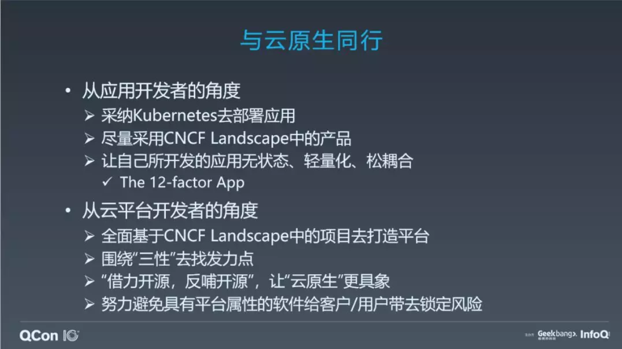 - 第二个建议是围绕“三性”去找发力点。云原生概念的提出,让不少云平台开发者觉得困惑,因为太抽象而使得每个人的理解不同而无法聚焦讨论,进一步导致不好找发力点。今天的云原生仍围绕着核心驱动力和“三性”在动态发展,随着发展的深入将变得愈加具象。在这种情形下,云平台开发者应当围绕这几个要素去审视自己的技术路径是否是云原生的,避免出现发展偏离。