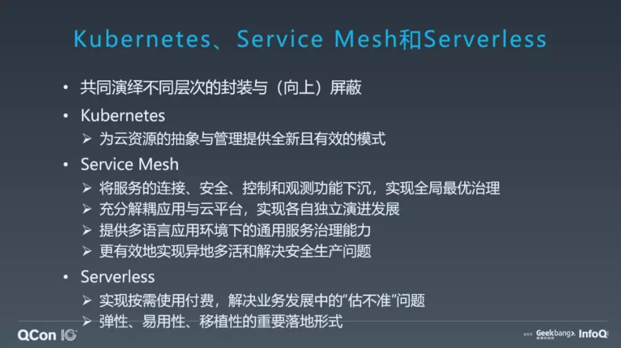 Kubernetes、Service Mesh 和 Serverless 三者共同演绎不同层次的封装和向上屏蔽下面的细节。Kubernetes 引入了不同的设计模式,实现对各种云资源全新、有效和优雅的抽象和管理模式,让集群的管理和应用发布变成了件相当轻松且不易出错的事。