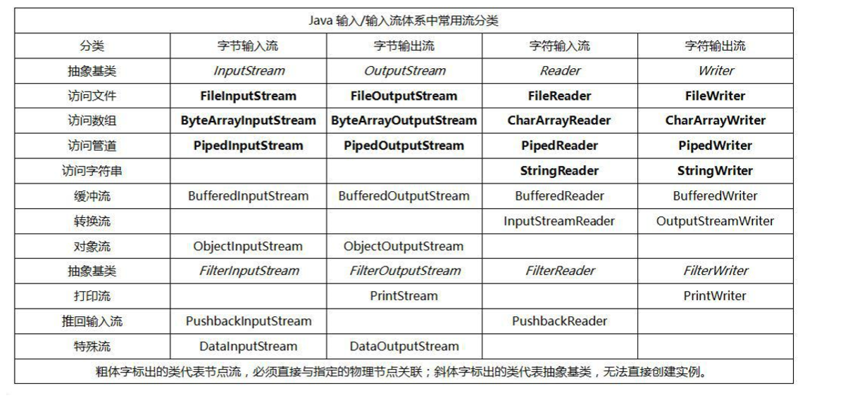 InputStream,OutputStream,FileInputStream,FileOutputStream,BufferedInputStream,BufferedOutputStreamReader,WriterBufferedReader,BufferedWriter