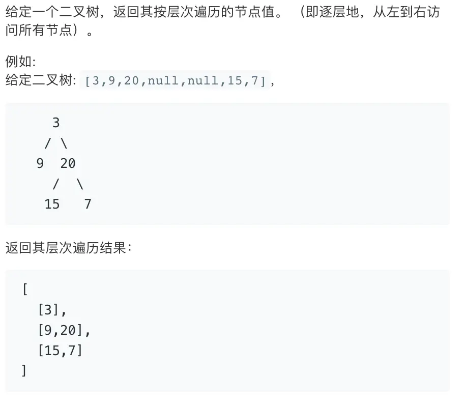 层序遍历是典型的广度优先应用,借助队列实现。可以使用python中collections.deque库,当然也可以不用只用简单的list也ok。看示例中结果的形式,不同层次需要放在不同列表中,因此我们必定要对每个节点属于的层次进行判断,相同层则放在同一列表,统一放入结果中。只要注意这一点,看代码就很直观了。