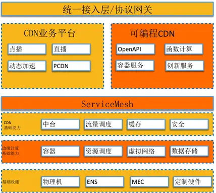 将 CDN 原有的服务与整个云原生的体系打通,策略上跟中心机房的业务没有本质的区别,过程是容器化接入到 K8s 以后,把里面通用的一些能力 API 化,通过 Servicemesh 提供出去。