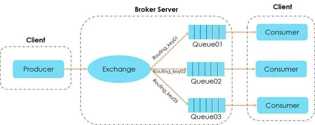 首先简单介绍 RabbitMQ 的运行原理,在 RabbitMQ 使用时,系统会先安装并启动 Broker Server,也就是 RabbitMQ 的服务中心。无论是生产者 (Producer),消费者(Consumer)都会通过连接池(Connection)使用 TCP/IP 协议(默认)来与 BrokerServer 进行连接。然后 Producer 会把 Exchange / Queue 的绑定信息发送到 Broker Server,Broker Server 根据 Exchange 的类型逻辑选择对应 Queue ,最后把信息发送到与 Queue 关联的对应 Consumer 。