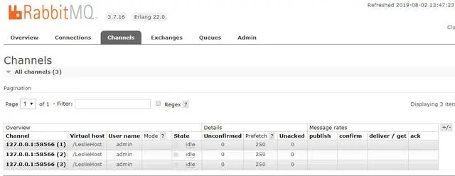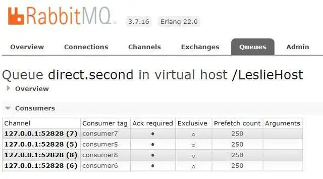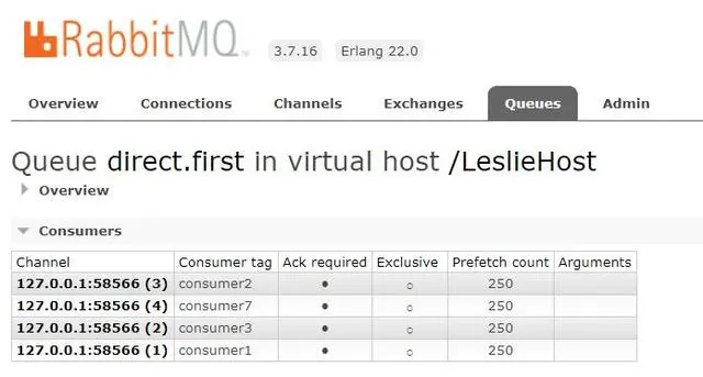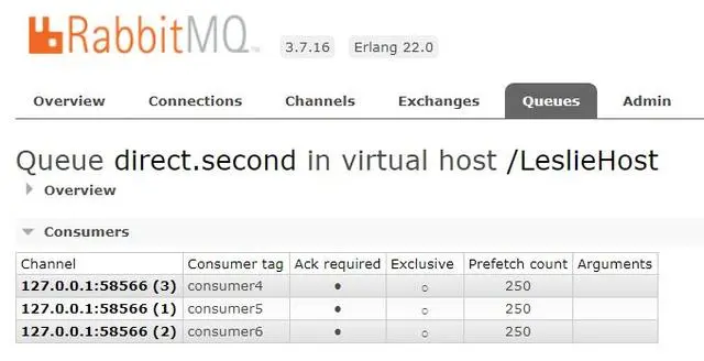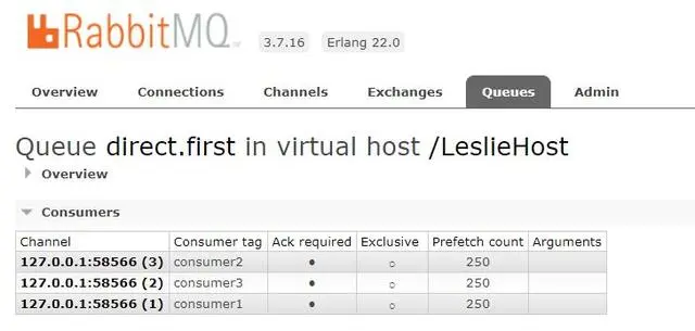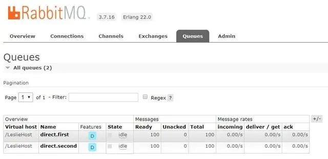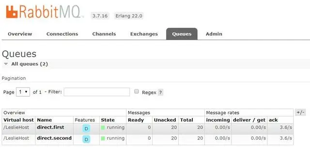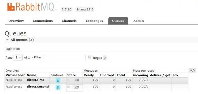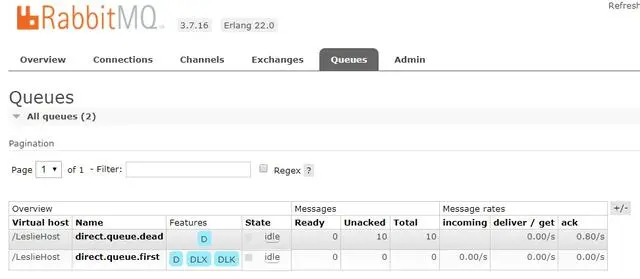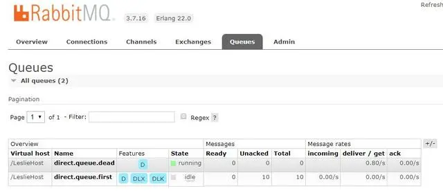 通过管理界面可以看,信息会先发送到 direct.queue.first,然后被放进死信队列作处理。