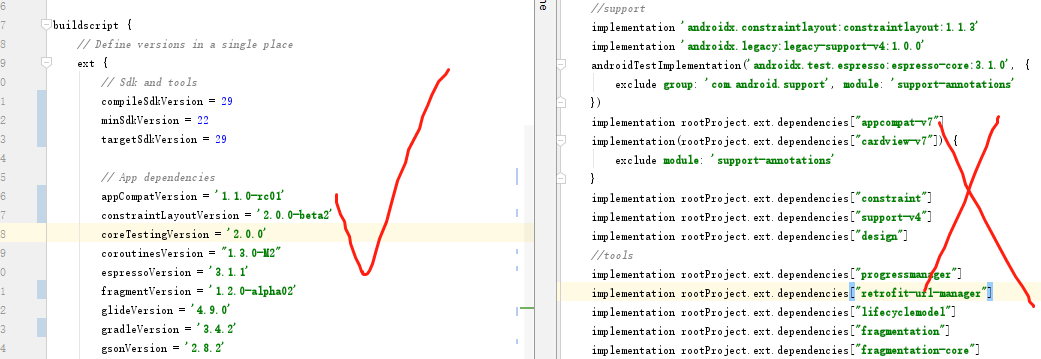 4.在最外层的build.gradle的ext中,定义用到的aar的版本号。为了保证AS能检测到最新的版本,请仅定义版本号