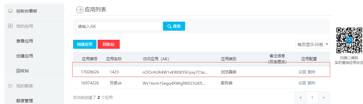 第三步:生成好的ak可以在控制台进行管理,而后面在前台项目中导入百度地图就是靠着者个ak