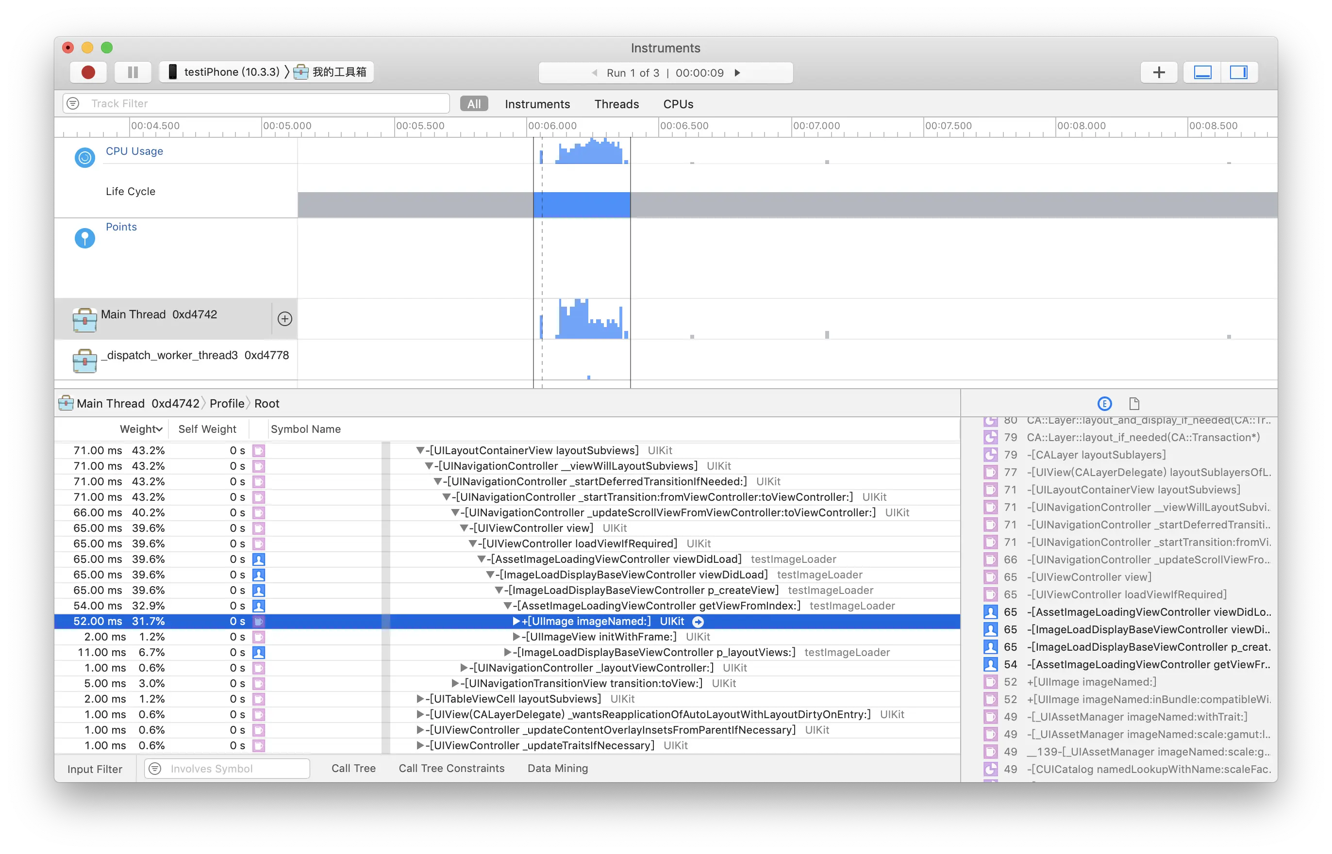 主要比较第一次加载图片的性能。测试案例加载了50张150*150的图片,测试机型:iphone5,系统iOS 10.3.3,测试工具,time Profiler。