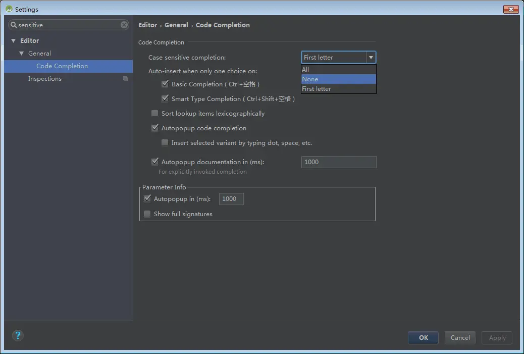 这个功能的打开,在不同平台中,是有些许不同的。 Windows平台: File -> Settings... 输入 sensitive 将 Case sensitive completion 右边的选项设置为None 然后 Apply 后就可以愉快地玩耍了。