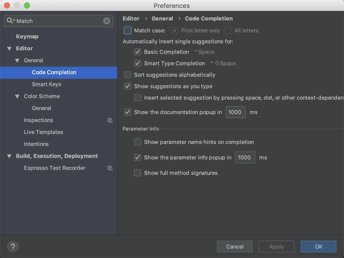 Mac平台: 左上方的 Android Studio -> Preferences... 输入 Match Case,在选项中选择 Editor -> General -> Code Completion 将 Match Case 前面勾选取消 然后 Apply 就 OK 了。