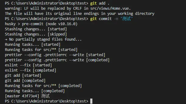 git add .git commit -m '测试'此时就会自动格式化后进行eslint校验,如果有错误的话,commit会失败,并给出eslint提示的错误,修改后再次提交就可以了,下面是成功的例子
