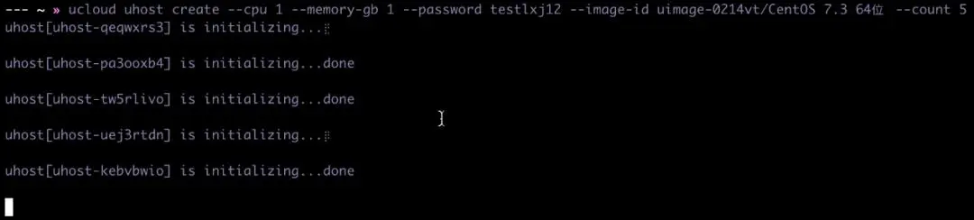$ ucloud uhost create —cpu 1 —memory-gb 2 —image-id uimage-xxx —password test123 —count 300