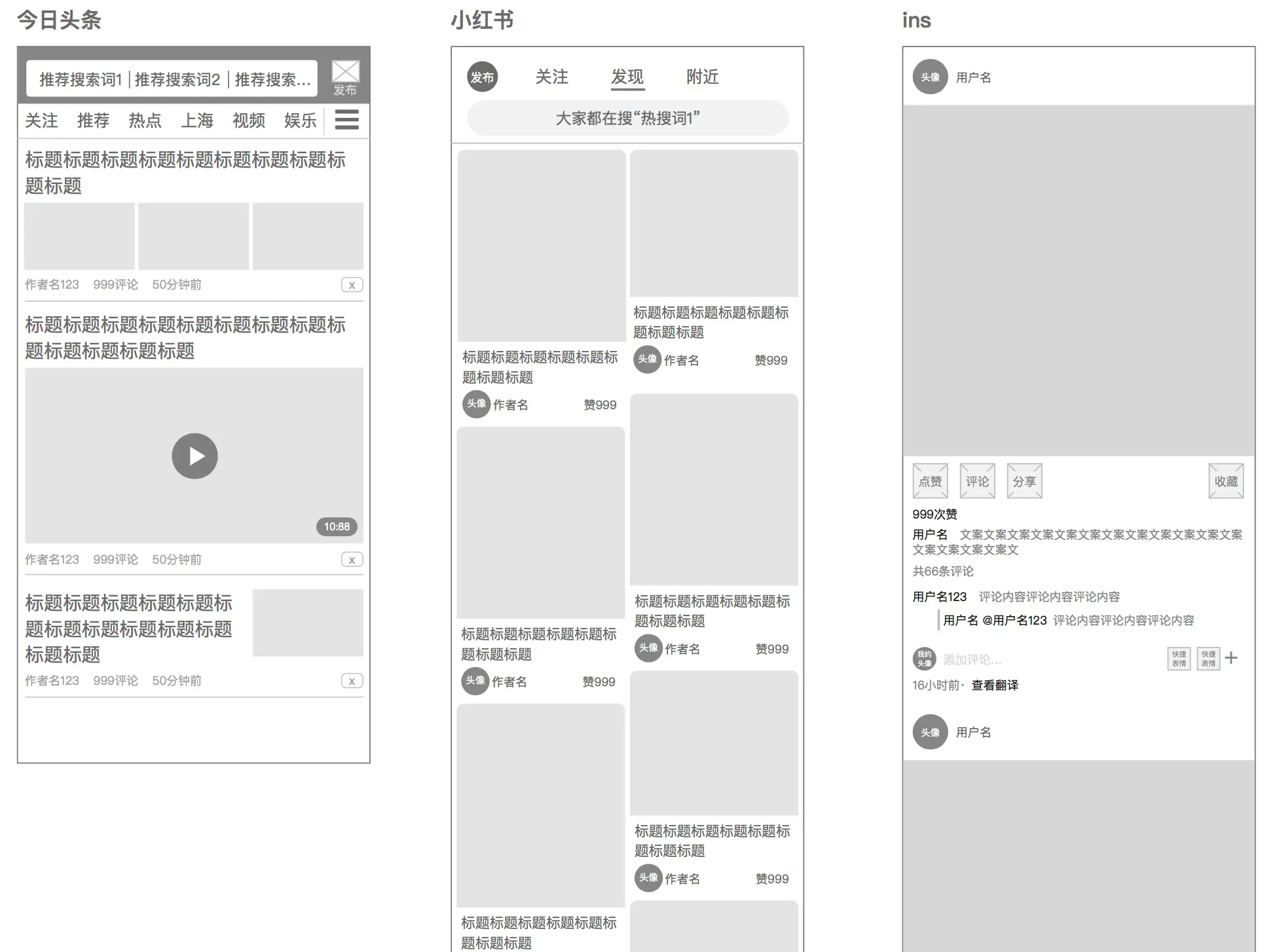 字段:头像、用户名、图/视频、更多操作(关注/举报/分享)、点赞、评论、分享、收藏、用户评论