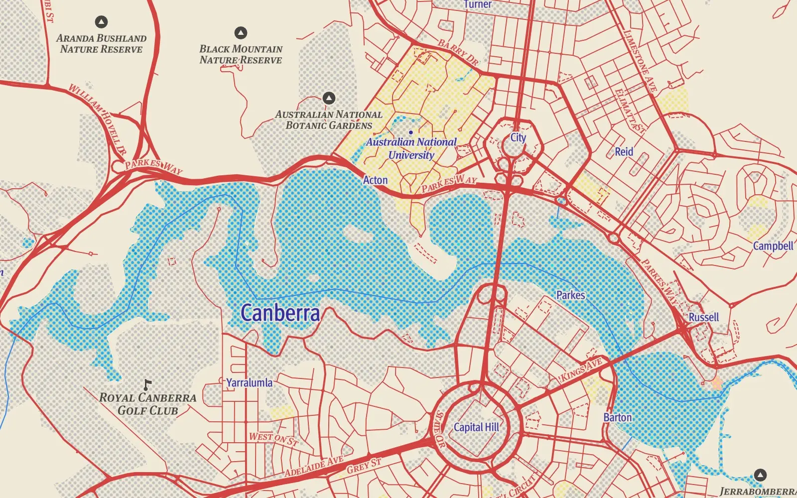 设计地图的难点之一是将弯弯曲曲的手写字体与直来直去的线条(道路和纬度圈)进行结合,并保证易读性。应该怎么做比较好呢?为了确保线条不会影响易读性,可以尝试在文本中添加一个光晕,类似于文本和线条之间 2 px 的缓冲区,让光晕与背景层保持相同的颜色,就不会分散设计的注意力。