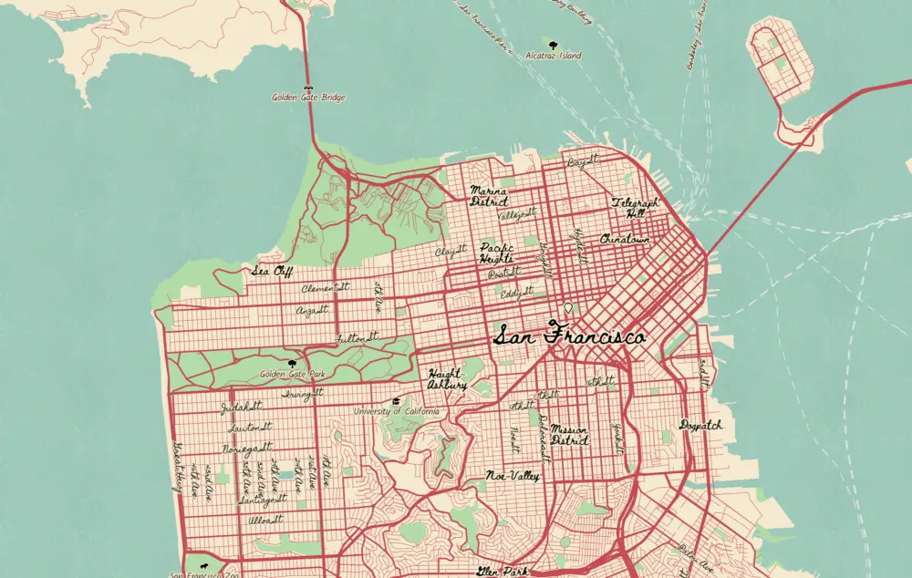 这张地图来自 Mapbox 官方地图设计师 Madison Draper,在艺术化的表达和阐述中,也着重突出了导航功能点,结合了 Mapbox Standard 的和 Mapbox North Star 两种风格,融合汽车导航和航海导航功能为一体,并且借助字体的变化营造一种寻宝的感觉。