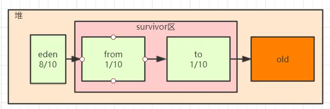 - from中满了,触发一次minorGC,存活的对象去了to区。这时Eden存活的对象不去from了 去to区。