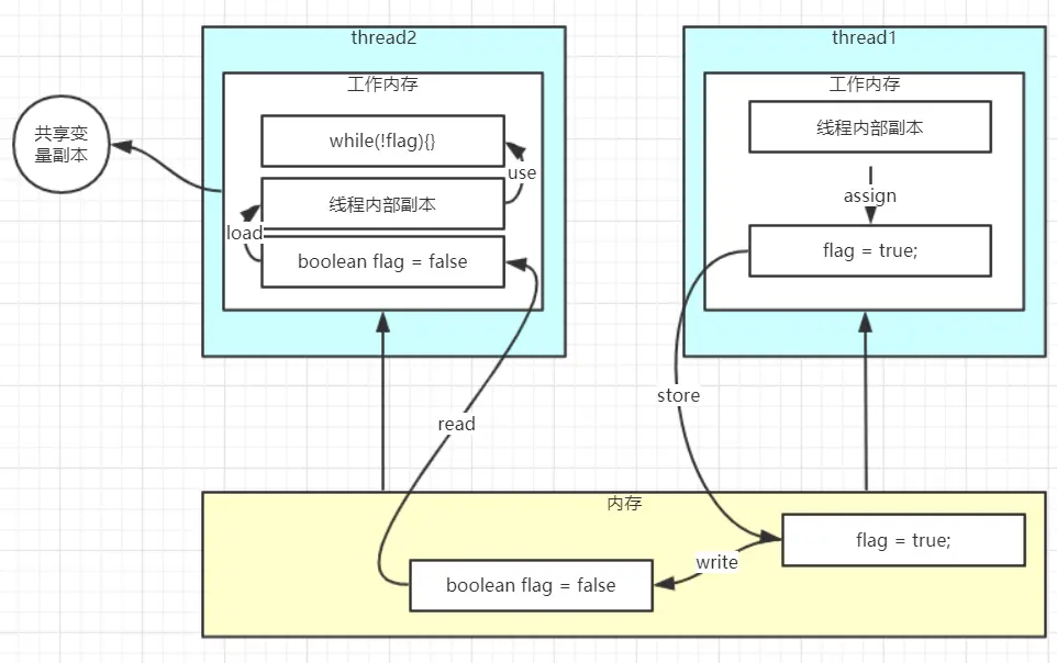store的过程经过总线,触发总线嗅探机制如果还没write,其他线程拿到的还是没修改的值。
