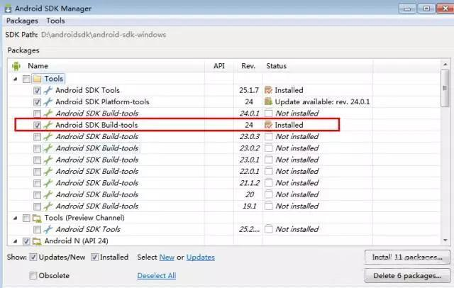 2.勾选build-tools,随便选一个版本,我这里选的是24的版本