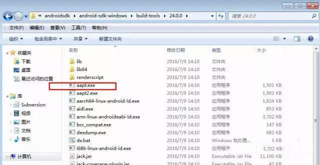 3.下载完成后,在D:\androidsdk\android-sdk-windows\build-tools\24.0.0目录下找到aapt.exe,将这个路径设置环境变量,添加到path下