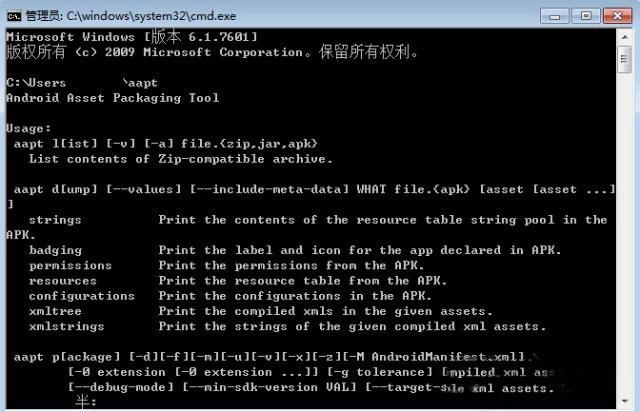 4.打开cmd。输入aapt出现如下界面,说明环境OK了