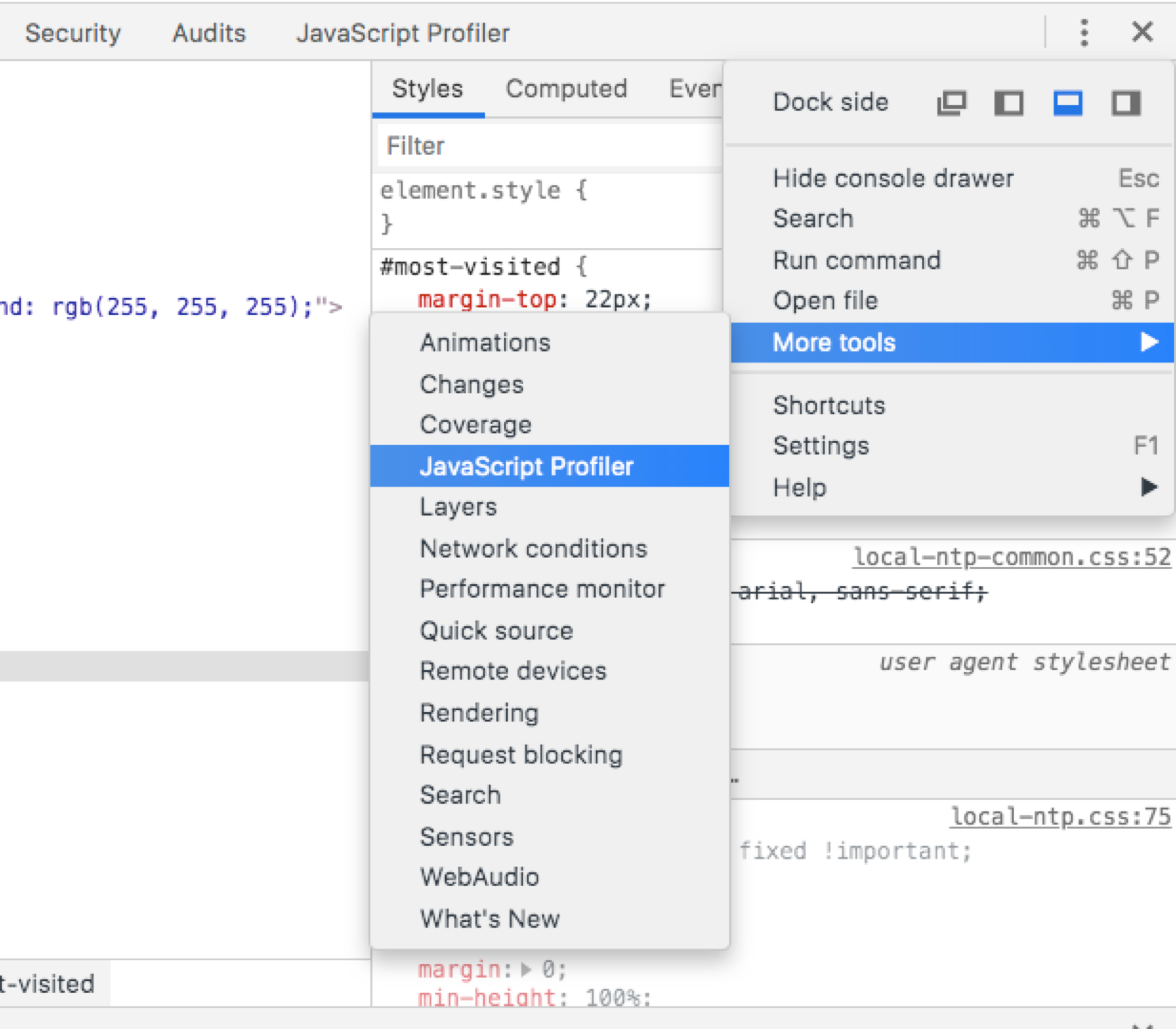 kill掉进程后,当前目录下就会出现一个cpuprofile文件,我们如何来分析呢?还是通过chrome浏览器来进行分析。点击开发者工具右侧的点->more tools->JavaScript Profiler就可以调出分析cpu profile文件的主页面,点击load导入profile文件。