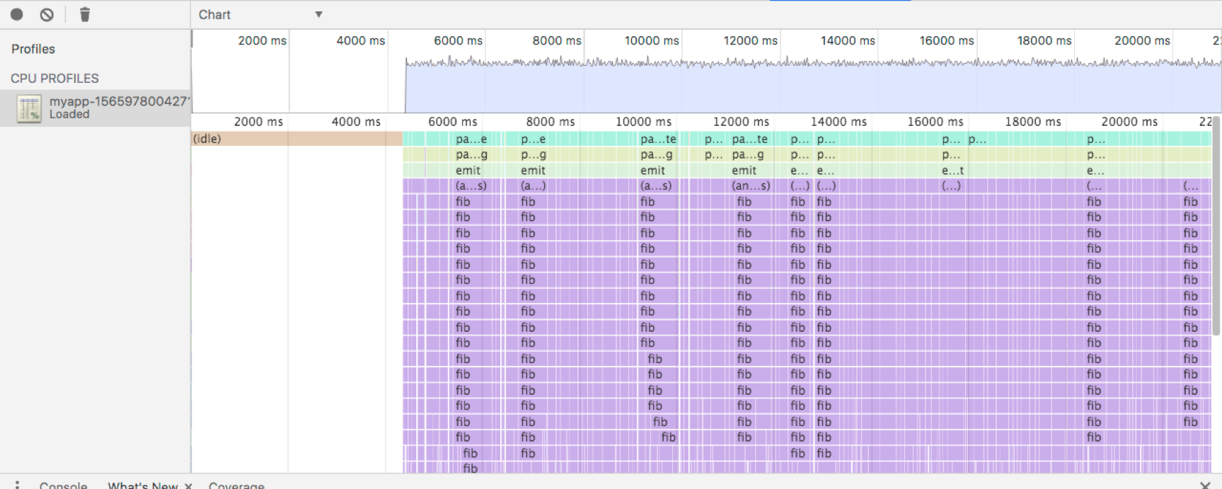 通过chart选项可以看到cpu时间分配的火焰图,和我们之前讲解javascript事件循环时分析的调用图很相近,在图中可以明显看出来,在空闲了4秒以后,服务端开始接收请求,请求期间进程最终调用的fib函数占用了cpu的绝大部分工作时间。