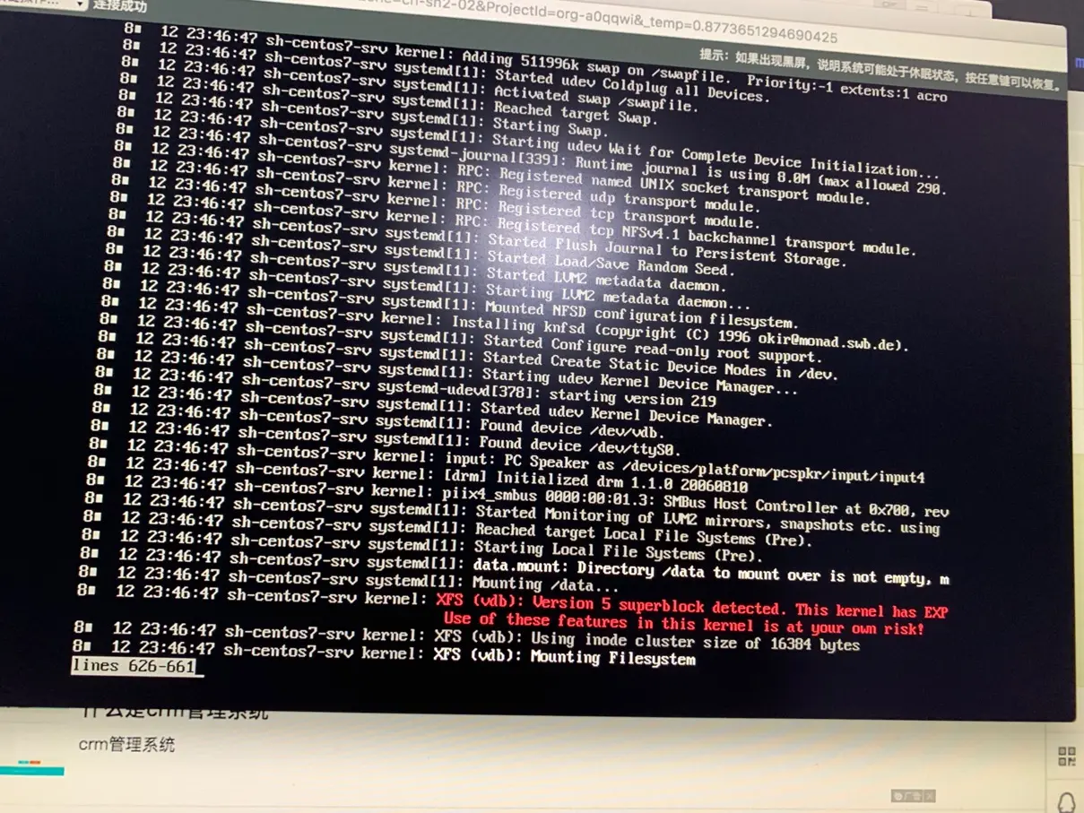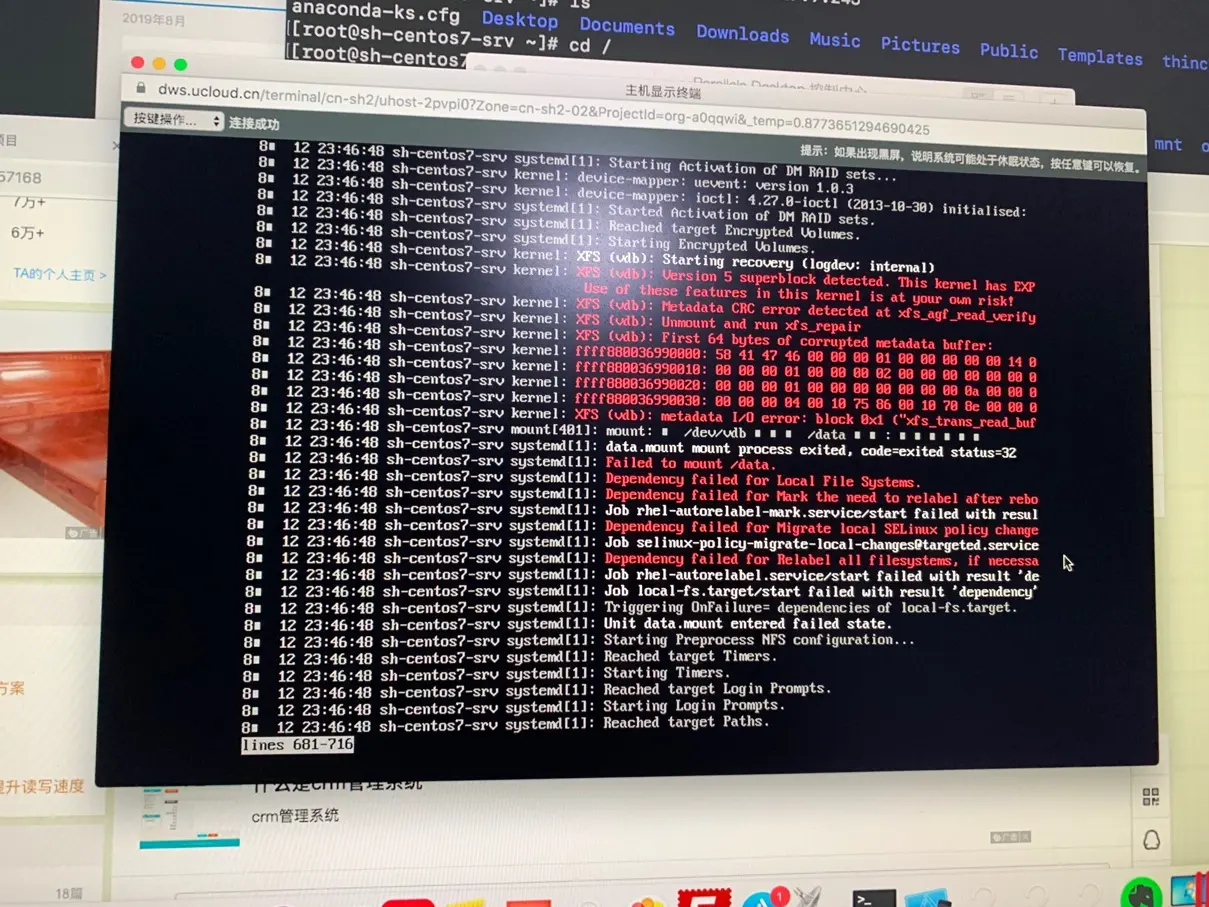随后的问题更严重了,由于迟迟无法正常关闭,我只能在云主机上点击断电关机。虽然云主机上的断电操作也是虚拟化的操作方式。但是随着断电操作的执行,linux终于又开始启动了,但是启动过程中开始出现了错误,最后虽然启动起来了,我却发现数据盘自动挂载失败了。于是,我尝试手动挂载数据盘,可是居然同样挂载不上,我开始慌了,里面的程序和数据可是有用的啊,有没有备份呢?脑子开始飞速地评估最坏的结果是什么。