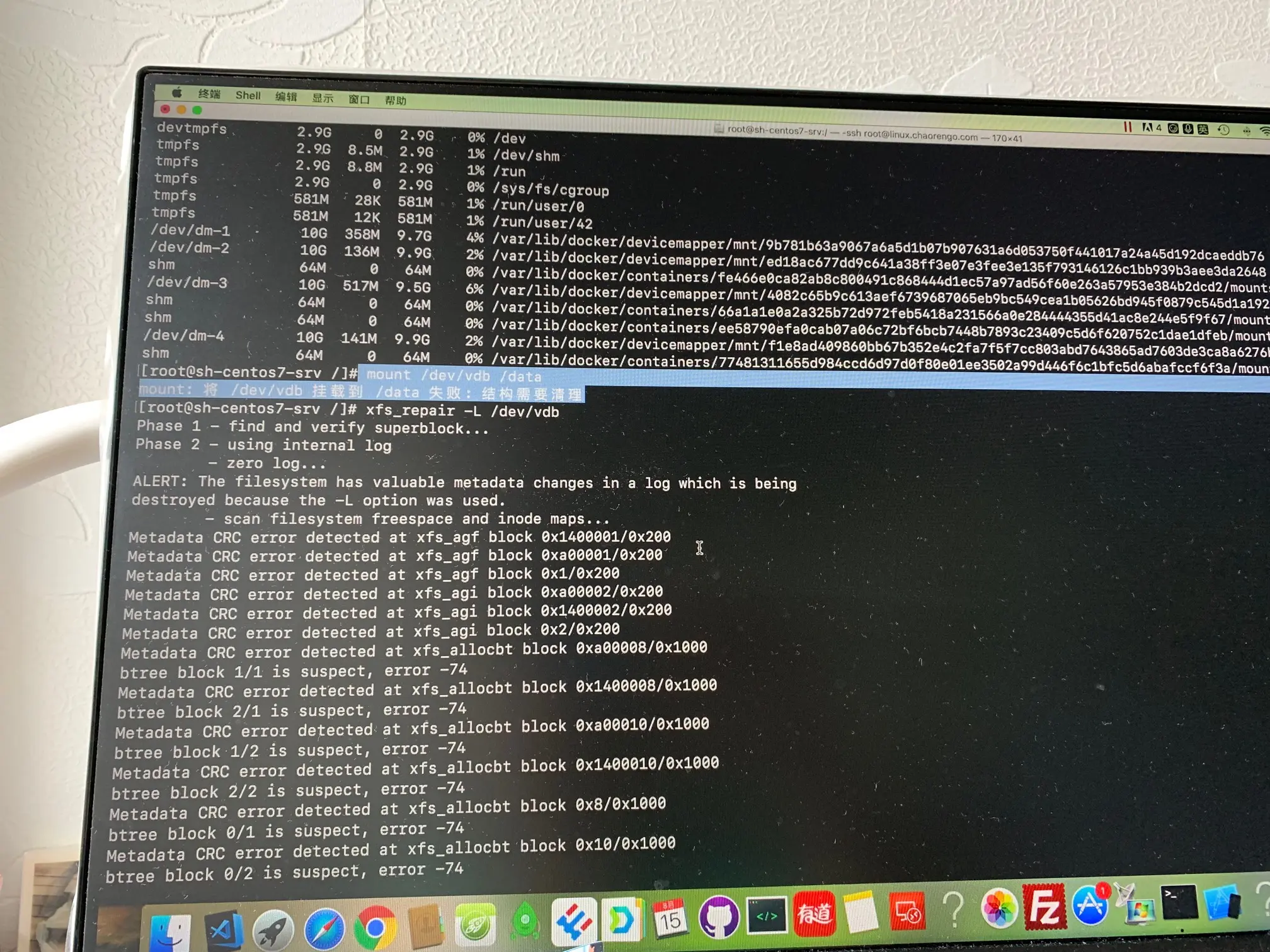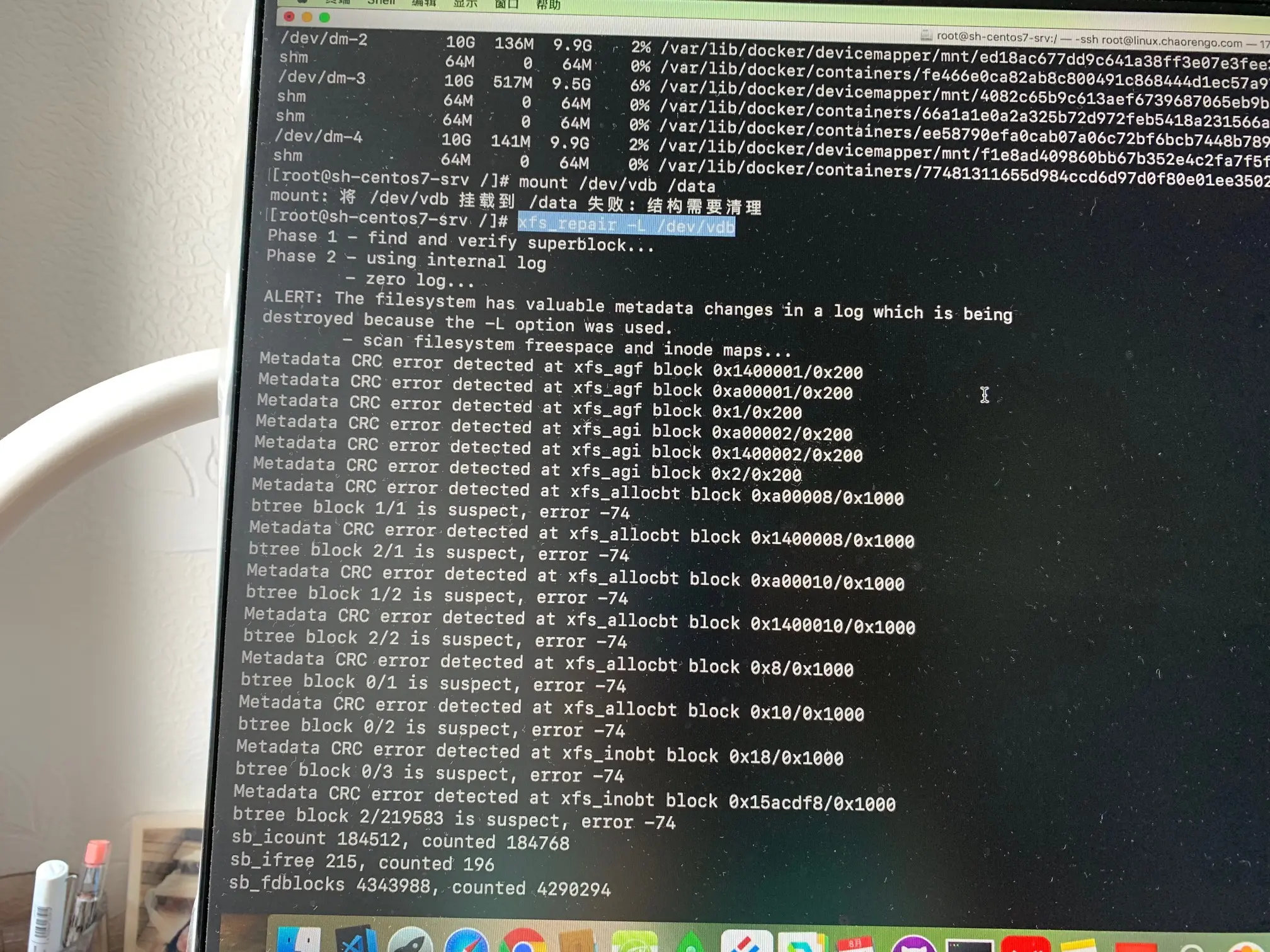 结果证明:的确修复成功,但是是加了xfs_repair -L参数的修复,重修挂载后,发现一个重要的项目目录彻底不见了,我后来从found+lost目录里找回来一些文件。可还是丢掉了一些重要的配置文件和前端代码。不过,幸好开发环境上还有备份,只不过配置得要重来再来一遍调试了,很是麻烦。