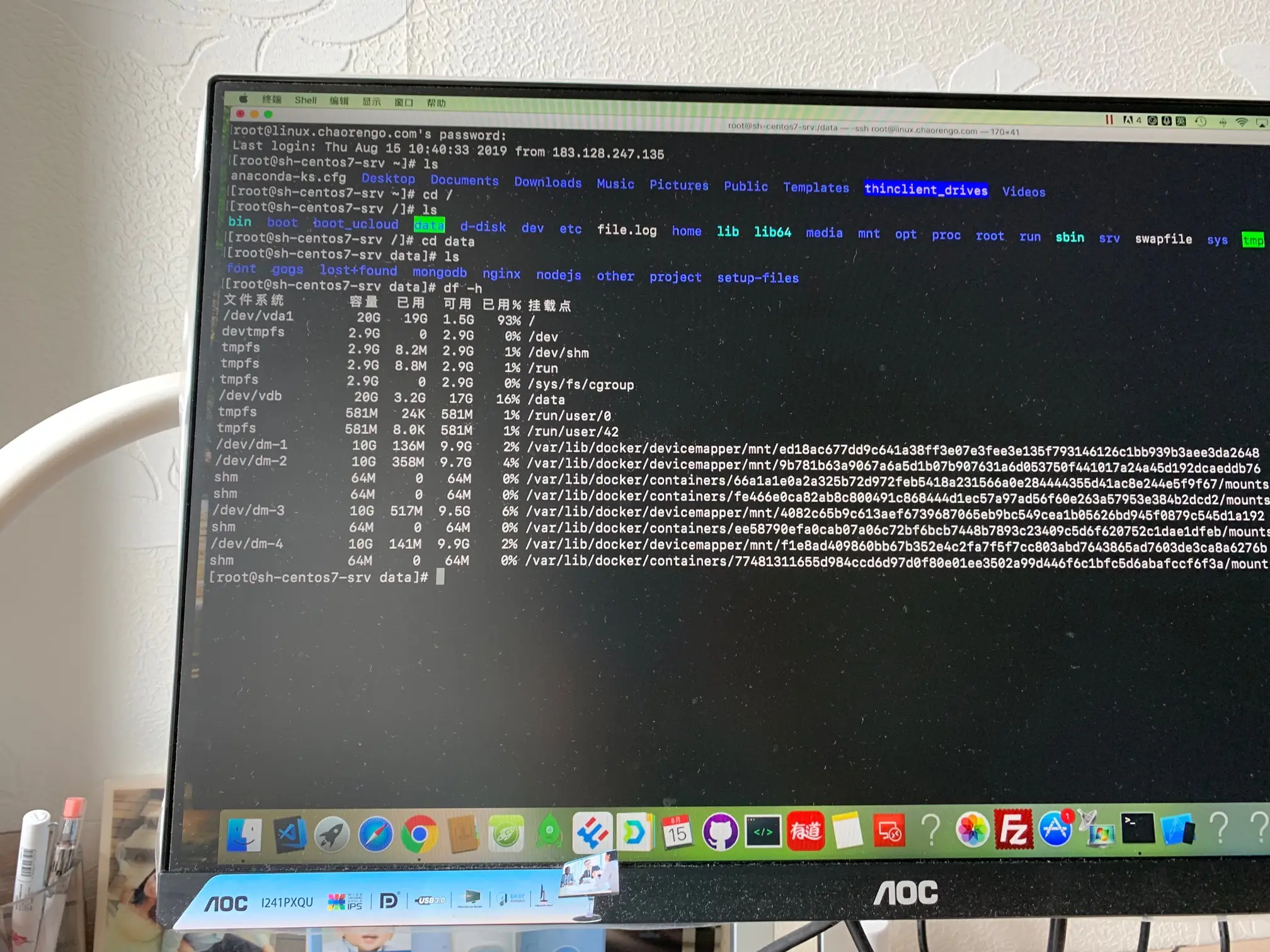可是有一天,我又上去玩容器,打算装一个git的guns版本。结果在安装过程中,突然提示我没有磁盘空间了。我的思维还是在windows服务器上的思维,查一查空间都被谁用了,然后看看能不能删除点什么。于是,我抱着这样的目的开始查找linux下的命令,df和du什么的。发现/var/log/下有不少日志文件。仔细查看了下,似乎占了不少空间。我想删除点日志应该没啥大影响,所以,就专门挑大的日志文件进行了删除,一下子删了好些个。然后,我再一次查看磁盘,哈哈空间又有了。所以回到数据盘上接着弄,这里我的数据盘是单独挂载在一个/data的目录下的。