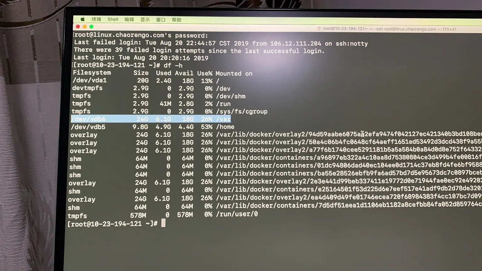 按照以上总结的方法,我快速重装了centos7系统,并对数据盘进行了分区,把数据盘分成了扩展分区,并在扩展分区内分了三个区,分别为:/dev/vdb5 10个G,用的ext4的文件系统; /dev/vdb6 24个G,用的xfs的文件系统,剩下6个G,分给了swap分区使用。 并且将:/dev/vdb5挂载到了/home目录,/dev/vdb6挂载到了/var目录。然后,迅速恢复安装了Docker和docker-compose软件,当容器创建好,执行df -h后,查看到了如下的容量占比结果。可以看出容器增加的占用是在/var目录里,也就放置在了数据盘上,不会影响系统盘的空间。以后,如果/usr占用太大,还可以挂在额外的数据盘,把/usr上的东西挪到新增的数据盘上,系统盘还是可以保持不受空间变化的太大影响。