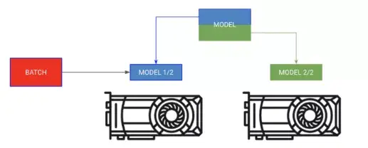 第一种方法叫做分批量训练。这一策略将模型复制到每个GPU上,而每个GPU会分到该批量的一部分。