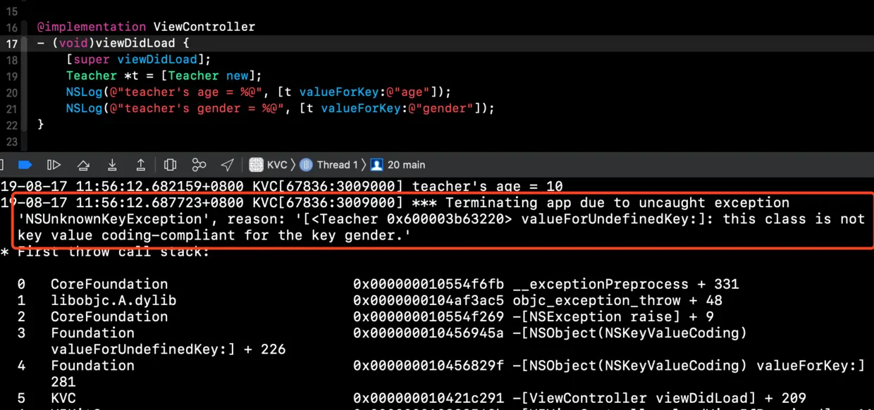 例如,当我尝试用KVC访问Teacher类中并不存在的变量“gender”时,程序直接Crash了: