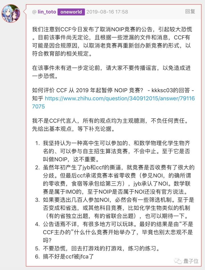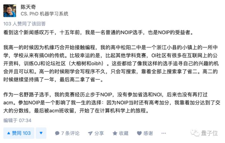 △ 陈天奇对NOIP停办的评论,图片来自知乎截图