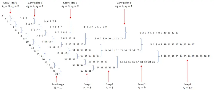 对于卷积两个感受野为3的上层单元,下一层最大能获得的感受野为 ,但因为有重叠,因此要减去(kernel_size - 1)个重叠部分