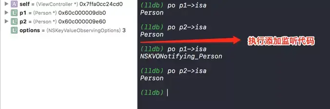 首先我们对上述代码中添加监听的地方打断点,看观察一下,addObserver方法对p1对象做了什么处理?也就是说p1对象在经过addObserver方法之后发生了什么改变,我们通过打印isa指针如下图所示