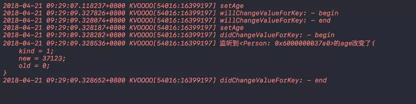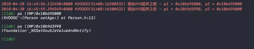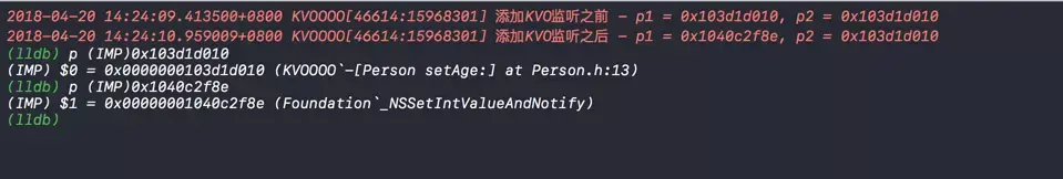 NSLog(@"添加KVO监听之后 - p1 = %p, p2 = %p", [p1 methodForSelector: @selector(setAge:)],[p2 methodForSelector: @selector(setAge:)]);