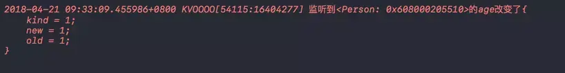 上述代码中可以看出,在添加监听之后,age属性的值在发生改变时,就会通知到监听者,执行监听者的observeValueForKeyPath方法。