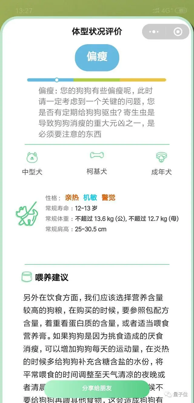 DeeCamp上这个名为HeyPup的小程序,打开小程序,只要给家里的狗狗拍张侧颜照,就能识别出狗狗是的品种、是否成年、体型状况如何、是否健康,并且给出相关的养育建议,提醒铲屎官:是不是该去给狗狗驱虫了?另外还能根据狗狗的健康状况,推荐合适的狗粮,还能一键跳转到电商平台购买。