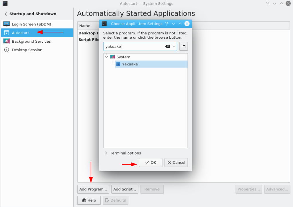 如果你运行 KDE,请打开系统设置,然后转到“启动和关闭”。将“yakuake”添加到“自动启动”下的程序列表中,如下所示: