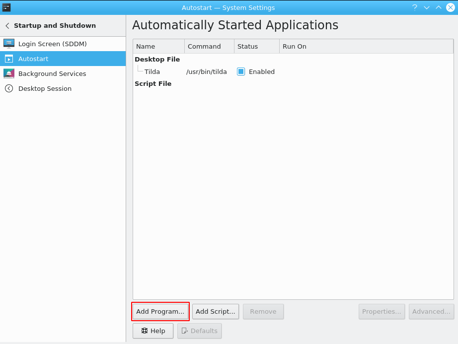 接下来,你要设置你的桌面自动启动 Tilda。如果你使用的是 KDE,请转到“系统设置 > 启动与关闭 > 自动启动”并“添加一个程序”。