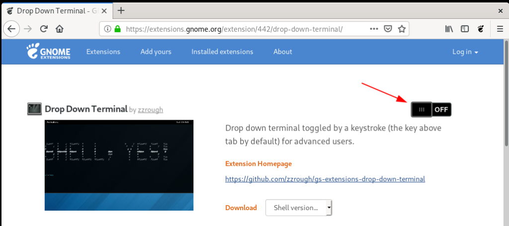 打开浏览器并转到此 GNOME 扩展的站点。启用扩展设置为“On”,如下所示: