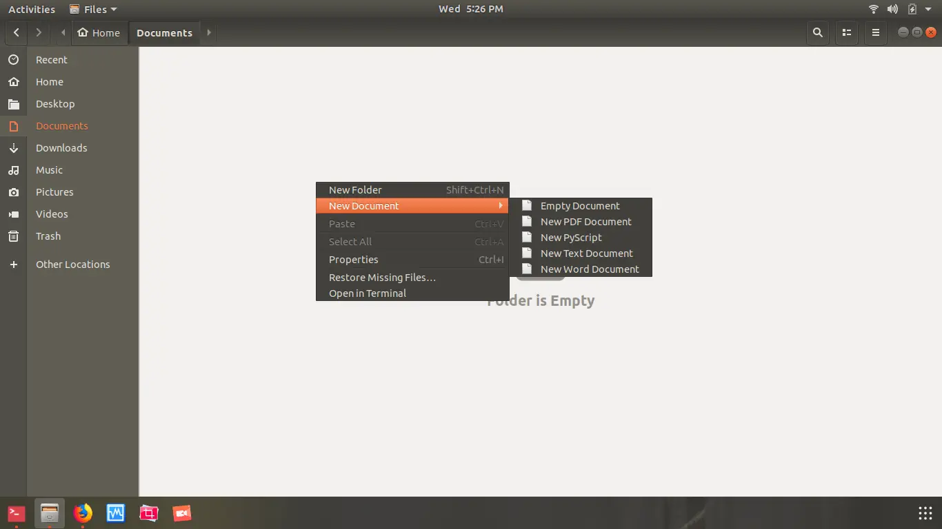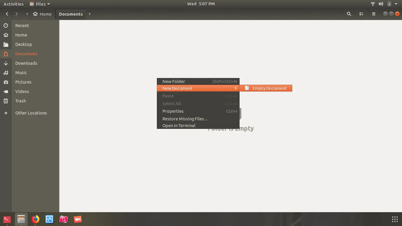 现在,打开 Nautilus 并检查“新建文件” 菜单中是否有相应的新建文件按钮。