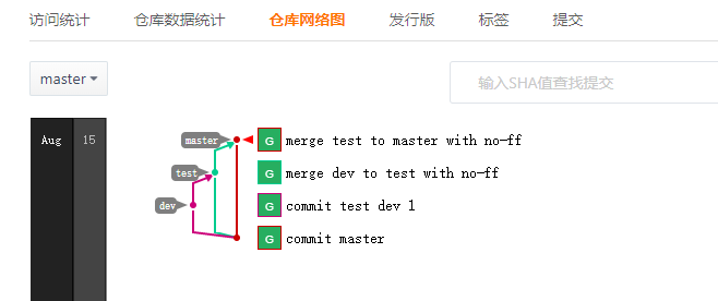 2 git merge --no-ff -m "merge test to master with no-ff" test